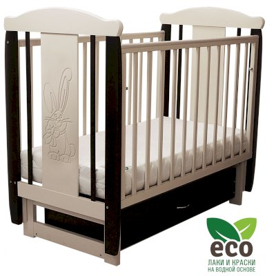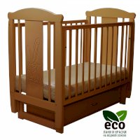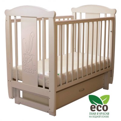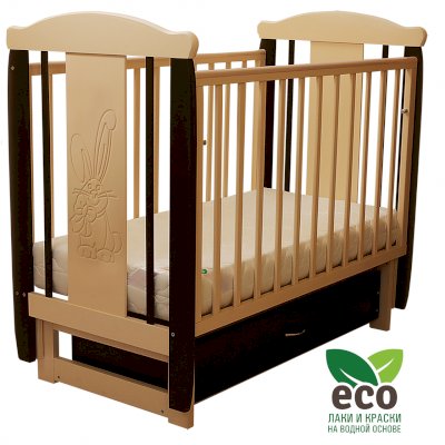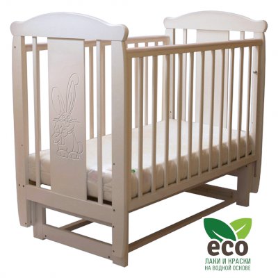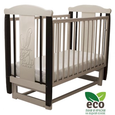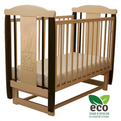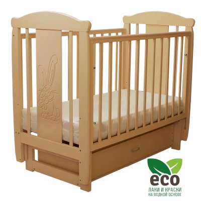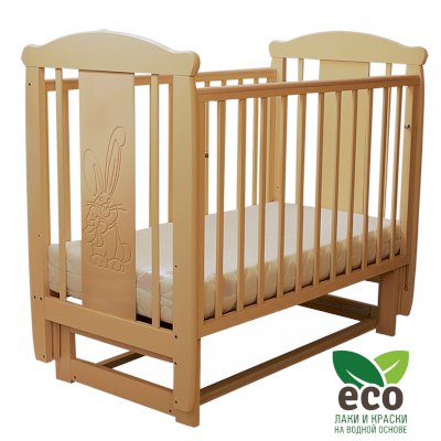 Кроватка декорирована фрезерным рисунком "Заяц с бантом". Уникальные фрезерные рисунки размером от 50 см на обеих спинках.